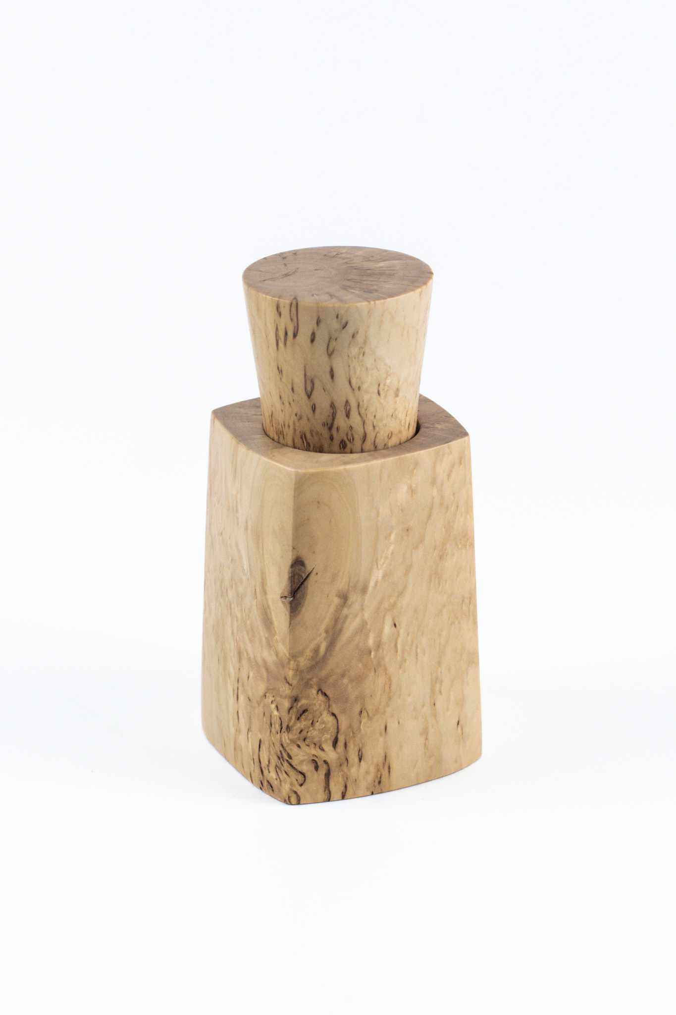 Eine sehr helle Mühle aus Ahornmaser. Das Maserbild ist geschmückt mit kleinen, perlmuttartigen „Spiegelchen“ und einigen winzigen dunklen „Augen“ im Holz. Haptisch wie optisch zart, fein und zurückhaltend. Durch ihre angenehm neutrale Farbe passt sie auf jeden Tisch und in jede Küche und lässt sich hervorragend zu einem Salz-Pfeffer-Set kombinieren.